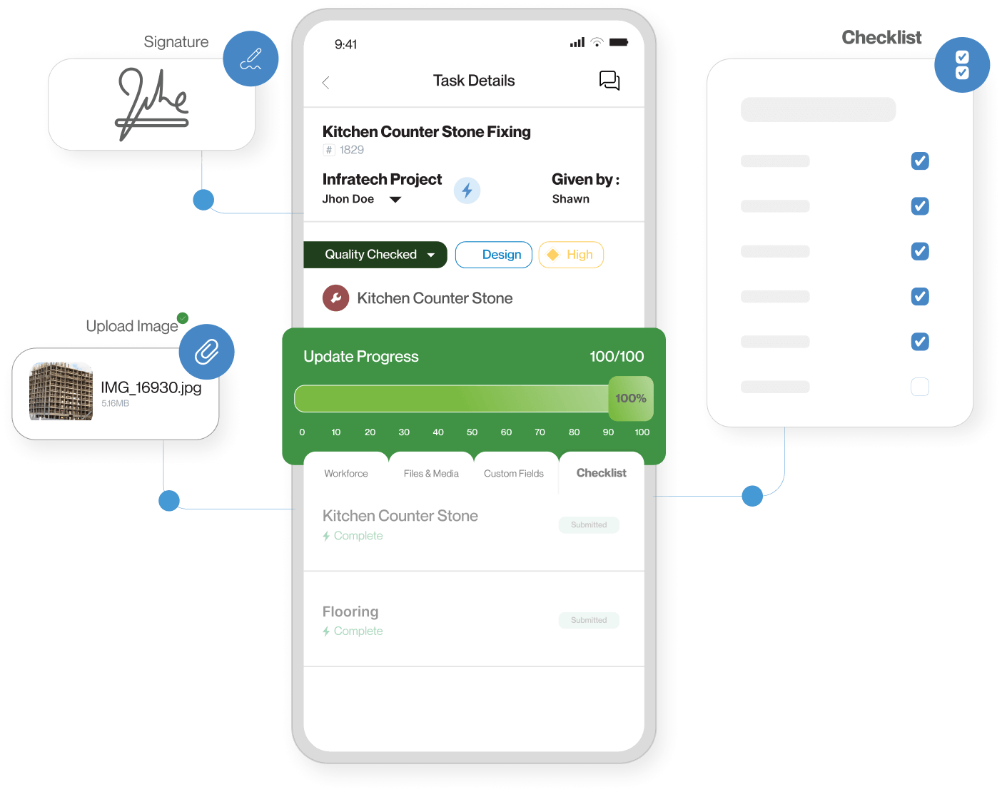 Create dynamic checklists for Quality and Safety Inspections. Add files and photos for authorising them for efficient handovers.
