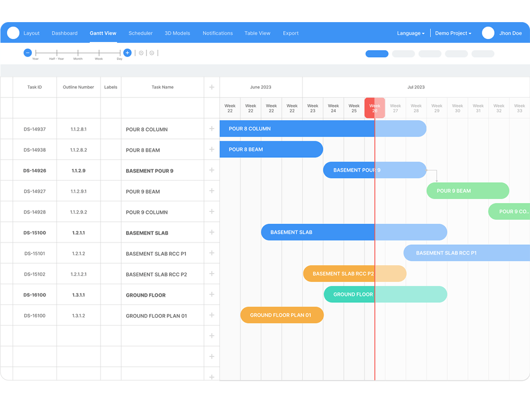 Visualise the project status with trade colours, task status, and potential bottlenecks in a live 4D BIM environment. Review the flow of trades across the various BIM model elements in your lookahead view. Compare the planned vs actual status on the 4D BIM Model as the updates come from site. Conduct constructability reviews through saved sets and filters for proactive decision making.