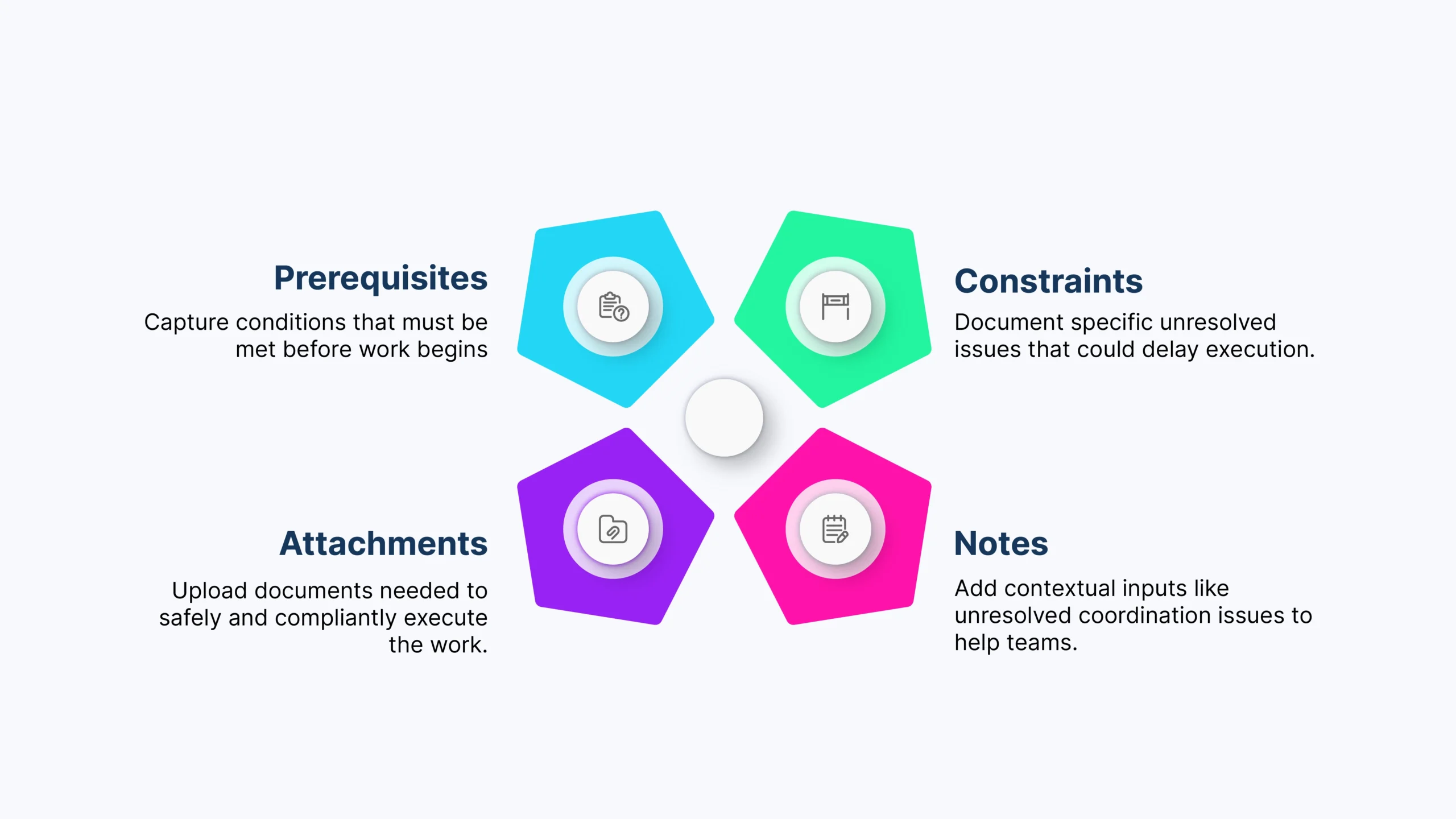 - Notes: Add contextual inputs like field observations or unresolved coordination issues, helping teams with surface constraints that don’t fit neatly into structured fields.